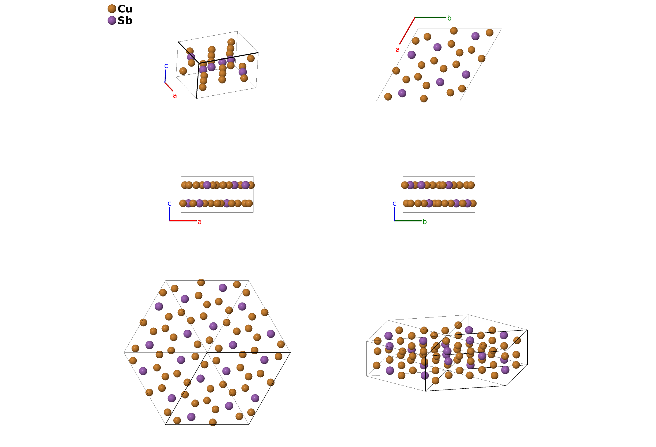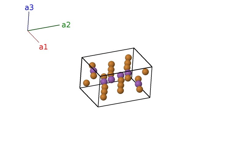 | $\mathbf{B_{6}}$ | = | $- x_{2} \, \mathbf{a}_{1}- y_{2} \, \mathbf{a}_{2}+\frac{3}{4} \, \mathbf{a}_{3}$ | = | $- \frac{1}{2}a \left(x_{2} + y_{2}\right) \,\mathbf{\hat{x}}+\frac{\sqrt{3}}{2}a \left(x_{2} - y_{2}\right) \,\mathbf{\hat{y}}+\frac{3}{4}c \,\mathbf{\hat{z}}$ | (6h) | Cu II |
