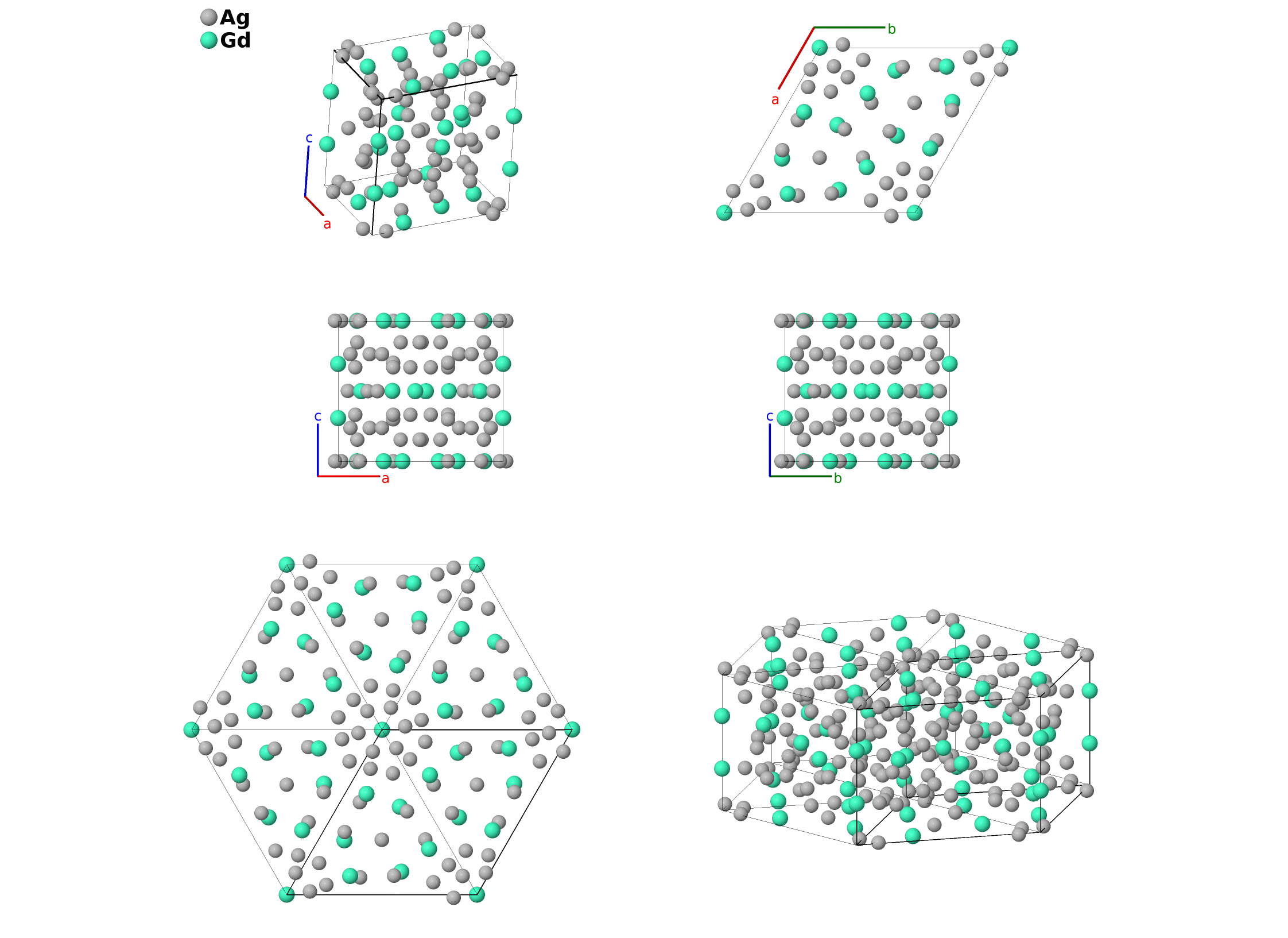 | $\mathbf{B_{6}}$ | = | $\frac{2}{3} \, \mathbf{a}_{1}+\frac{1}{3} \, \mathbf{a}_{2}+z_{3} \, \mathbf{a}_{3}$ | = | $\frac{1}{2}a \,\mathbf{\hat{x}}- \frac{\sqrt{3}}{6}a \,\mathbf{\hat{y}}+c z_{3} \,\mathbf{\hat{z}}$ | (4h) | Ag II |