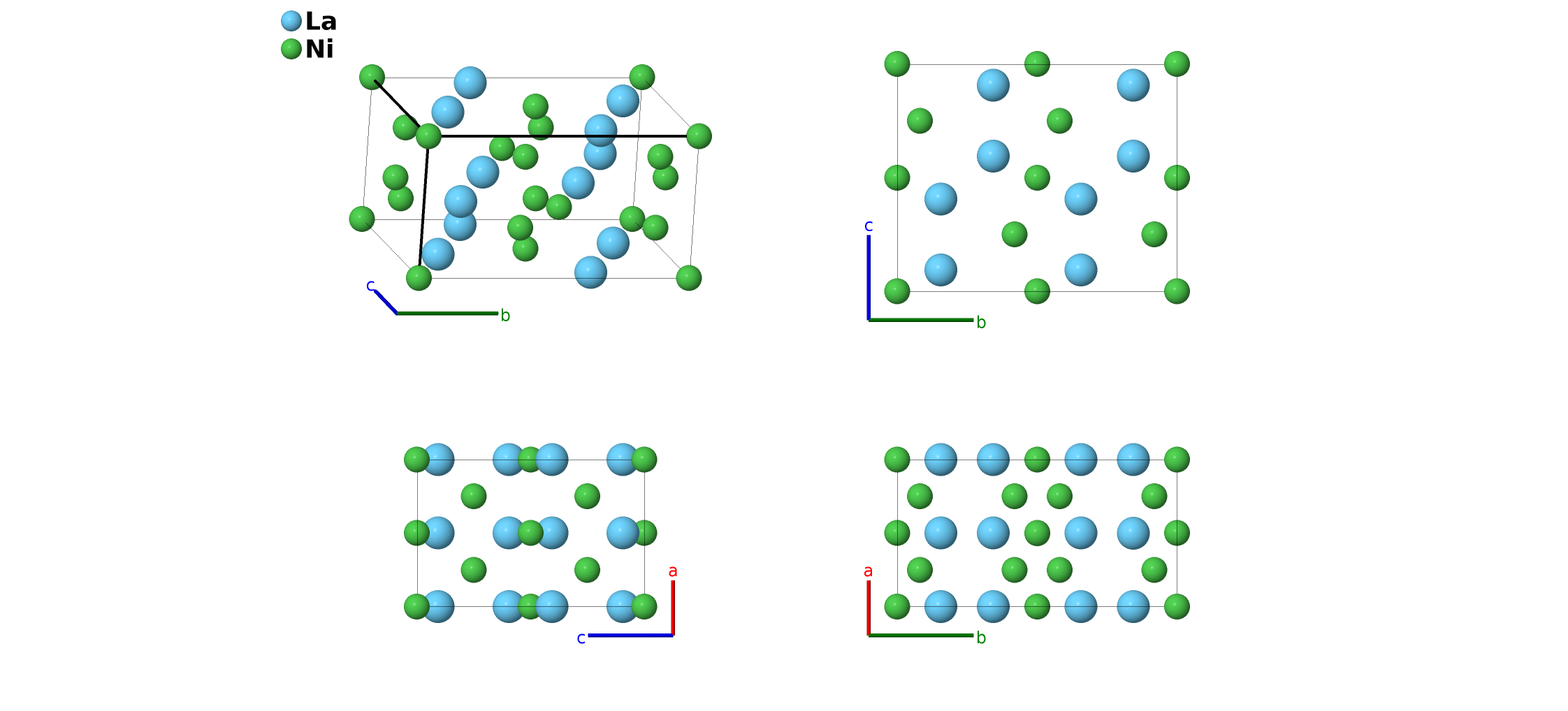 | $\mathbf{B_{2}}$ | = | $\frac{1}{2} \, \mathbf{a}_{1}+\frac{1}{2} \, \mathbf{a}_{2}+\frac{1}{2} \, \mathbf{a}_{3}$ | = | $\frac{1}{2}a \,\mathbf{\hat{x}}+\frac{1}{2}c \,\mathbf{\hat{z}}$ | (4a) | Ni I |