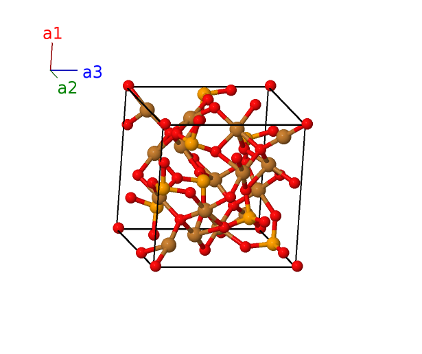 | $\mathbf{B_{23}}$ | = | $- x_{6} \, \mathbf{a}_{1}+\left(y_{6} + \frac{1}{2}\right) \, \mathbf{a}_{2}- \left(z_{6} - \frac{1}{2}\right) \, \mathbf{a}_{3}$ | = | $- a x_{6} \,\mathbf{\hat{x}}+a \left(y_{6} + \frac{1}{2}\right) \,\mathbf{\hat{y}}- a \left(z_{6} - \frac{1}{2}\right) \,\mathbf{\hat{z}}$ | (12b) | Cu II |