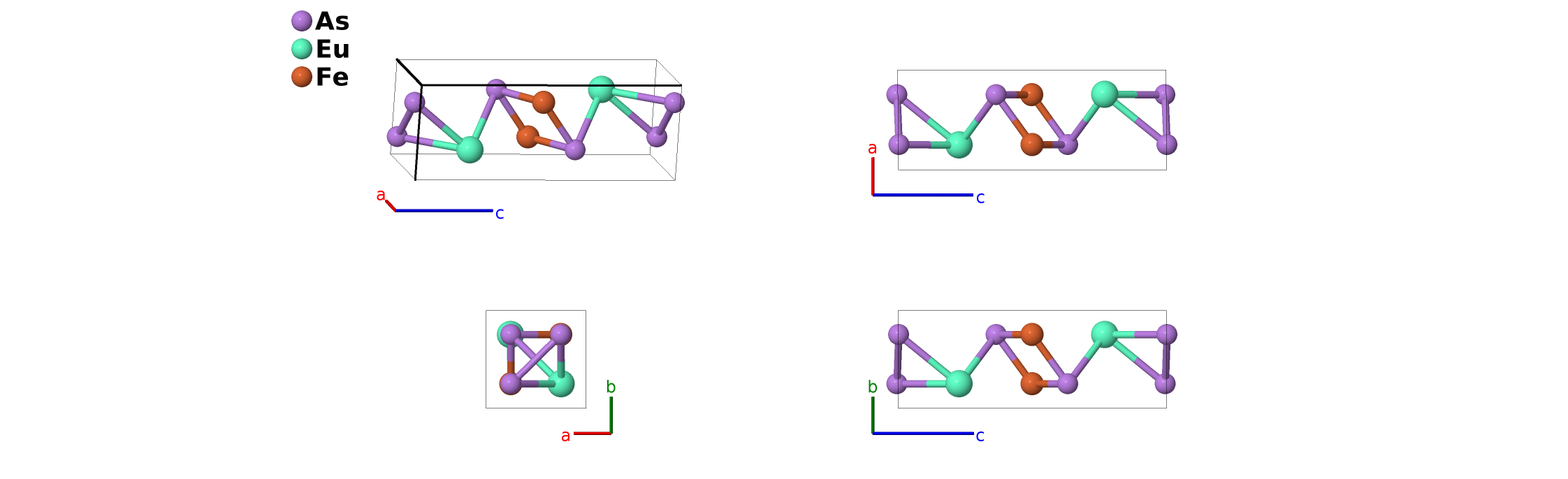 | $\mathbf{B_{5}}$ | = | $x_{3} \, \mathbf{a}_{1}+\frac{1}{4} \, \mathbf{a}_{2}+z_{3} \, \mathbf{a}_{3}$ | = | $\left(a x_{3} + c z_{3} \cos{\beta}\right) \,\mathbf{\hat{x}}+\frac{1}{4}b \,\mathbf{\hat{y}}+c z_{3} \sin{\beta} \,\mathbf{\hat{z}}$ | (2e) | Eu I |