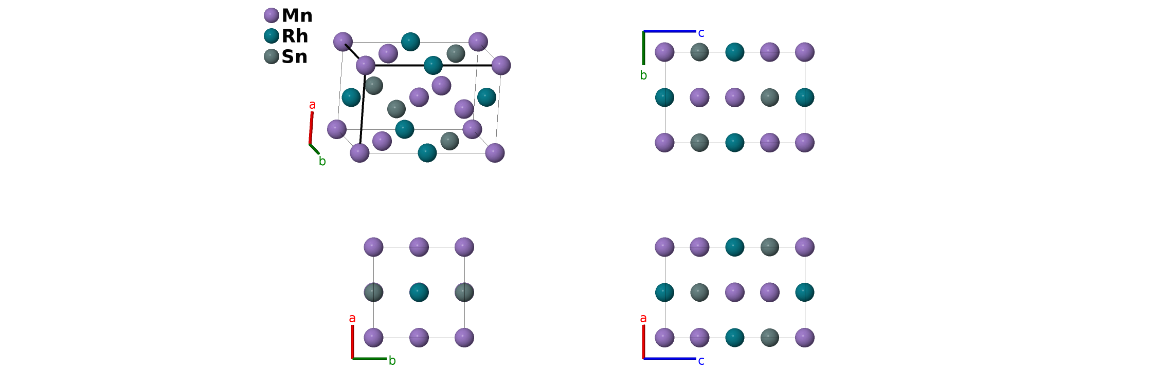 | $\mathbf{B_{3}}$ | = | $\frac{3}{4} \, \mathbf{a}_{1}+\frac{1}{4} \, \mathbf{a}_{2}+\frac{1}{2} \, \mathbf{a}_{3}$ | = | $\frac{1}{2}a \,\mathbf{\hat{y}}+\frac{1}{4}c \,\mathbf{\hat{z}}$ | (2c) | Mn II |
