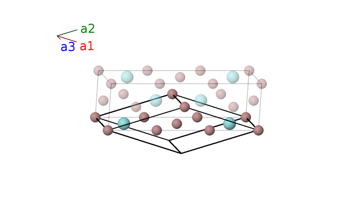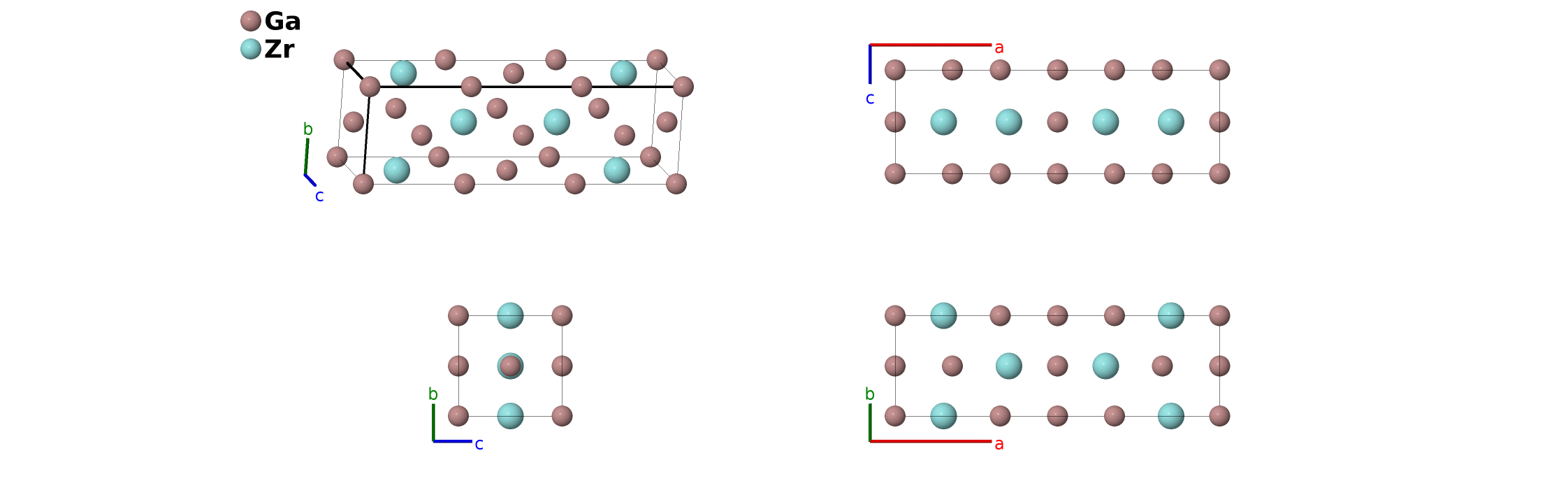 | $\mathbf{B_{2}}$ | = | $\frac{1}{2} \, \mathbf{a}_{1}+\frac{1}{2} \, \mathbf{a}_{2}+\frac{1}{2} \, \mathbf{a}_{3}$ | = | $\frac{1}{2}a \,\mathbf{\hat{x}}+\frac{1}{2}c \,\mathbf{\hat{z}}$ | (2c) | Ga II |