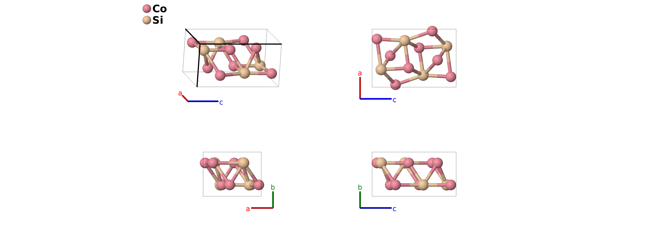 | $\mathbf{B_{7}}$ | = | $- x_{2} \, \mathbf{a}_{1}+\frac{3}{4} \, \mathbf{a}_{2}- z_{2} \, \mathbf{a}_{3}$ | = | $- a x_{2} \,\mathbf{\hat{x}}+\frac{3}{4}b \,\mathbf{\hat{y}}- c z_{2} \,\mathbf{\hat{z}}$ | (4c) | Co II |
