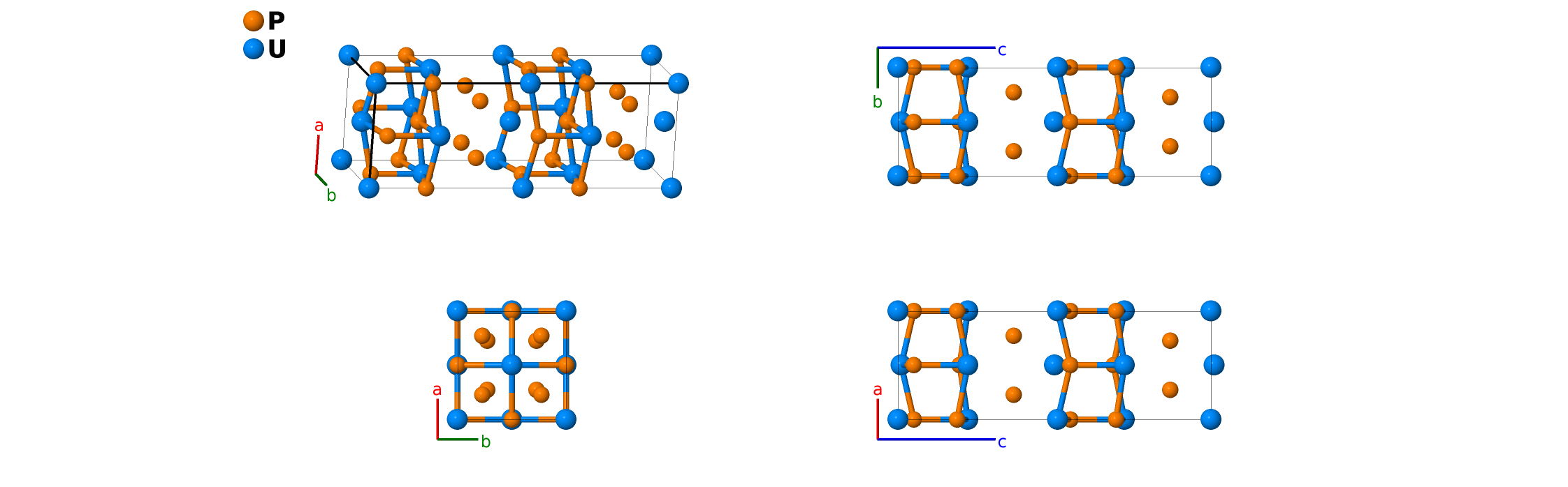 | $\mathbf{B_{7}}$ | = | $\left(z_{6} + \frac{1}{2}\right) \, \mathbf{a}_{1}+z_{6} \, \mathbf{a}_{2}+\frac{1}{2} \, \mathbf{a}_{3}$ | = | $\frac{1}{2}a \,\mathbf{\hat{y}}+c z_{6} \,\mathbf{\hat{z}}$ | (4b) | U III |