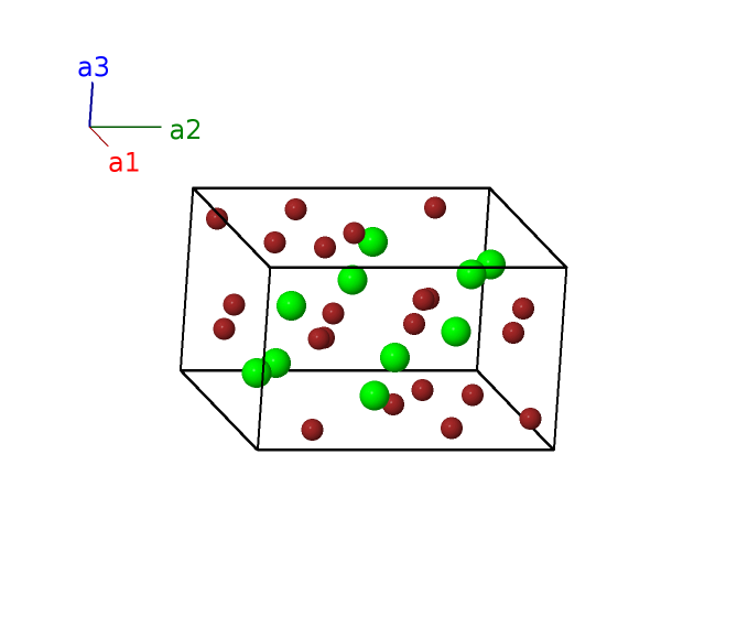 | $\mathbf{B_{3}}$ | = | $\frac{1}{4} \, \mathbf{a}_{1}+\frac{3}{4} \, \mathbf{a}_{2}+\frac{1}{2} \, \mathbf{a}_{3}$ | = | $\frac{1}{4}a \,\mathbf{\hat{x}}+\frac{3}{4}a \,\mathbf{\hat{y}}+\frac{1}{2}c \,\mathbf{\hat{z}}$ | (2b) | Br II |