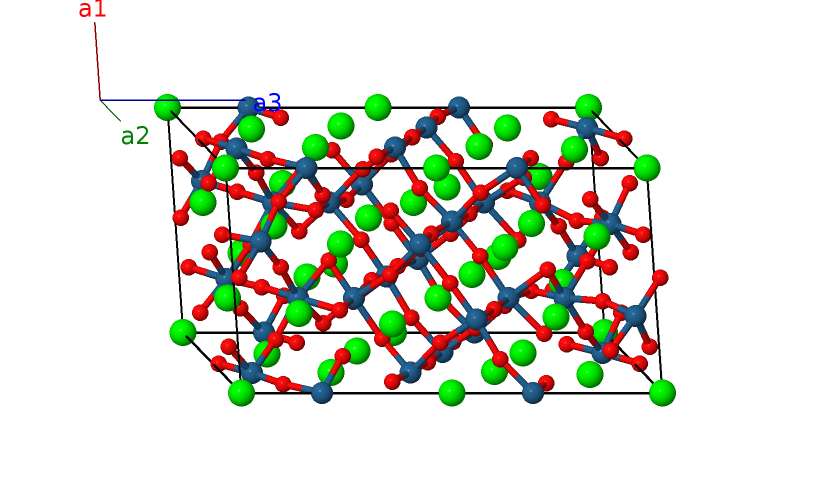 | $\mathbf{B_{12}}$ | = | $\frac{2}{3} \, \mathbf{a}_{1}+\frac{1}{3} \, \mathbf{a}_{2}+z_{4} \, \mathbf{a}_{3}$ | = | $\frac{1}{2}a \,\mathbf{\hat{x}}- \frac{\sqrt{3}}{6}a \,\mathbf{\hat{y}}+c z_{4} \,\mathbf{\hat{z}}$ | (4b) | Os III |