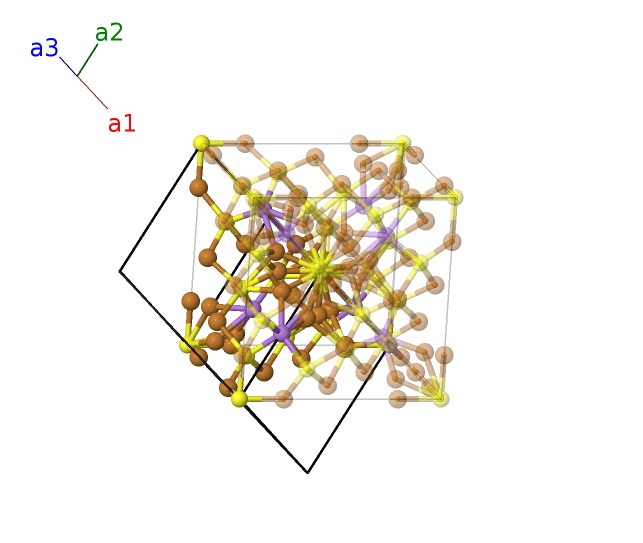 | $\mathbf{B_{9}}$ | = | $\frac{1}{4} \, \mathbf{a}_{1}+\frac{1}{2} \, \mathbf{a}_{2}+\frac{3}{4} \, \mathbf{a}_{3}$ | = | $\frac{1}{2}a \,\mathbf{\hat{x}}+\frac{1}{4}a \,\mathbf{\hat{y}}$ | (12d) | Cu I |