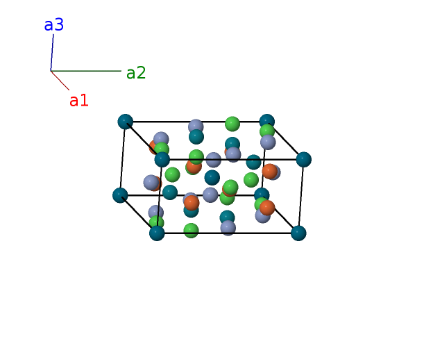 | $\mathbf{B_{27}}$ | = | $- \left(x_{5} - \frac{1}{2}\right) \, \mathbf{a}_{1}+\left(x_{5} + \frac{1}{2}\right) \, \mathbf{a}_{2}- \left(z_{5} - \frac{1}{2}\right) \, \mathbf{a}_{3}$ | = | $- a \left(x_{5} - \frac{1}{2}\right) \,\mathbf{\hat{x}}+a \left(x_{5} + \frac{1}{2}\right) \,\mathbf{\hat{y}}- c \left(z_{5} - \frac{1}{2}\right) \,\mathbf{\hat{z}}$ | (8j) | Fe I |