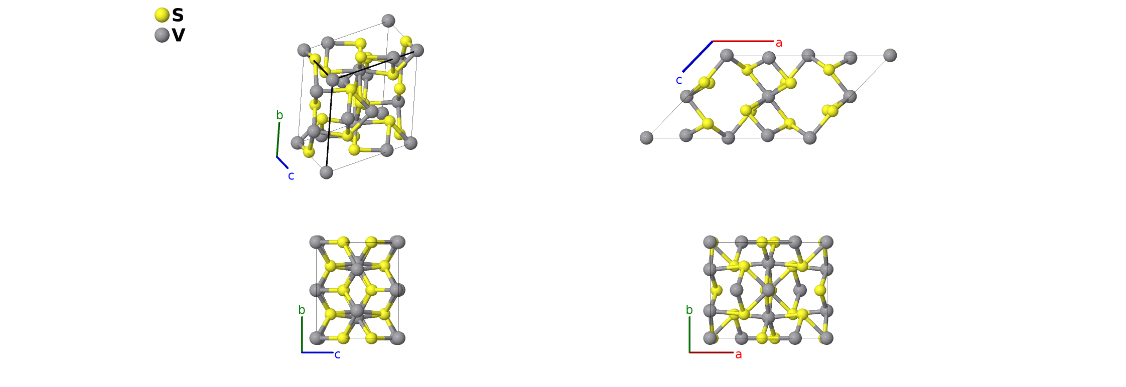 | $\mathbf{B_{3}}$ | = | $y_{2} \, \mathbf{a}_{1}- y_{2} \, \mathbf{a}_{2}+\frac{1}{2} \, \mathbf{a}_{3}$ | = | $\frac{1}{2}c \cos{\beta} \,\mathbf{\hat{x}}- b y_{2} \,\mathbf{\hat{y}}+\frac{1}{2}c \sin{\beta} \,\mathbf{\hat{z}}$ | (4h) | V II |
