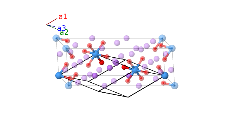 | $\mathbf{B_{5}}$ | = | $z_{3} \, \mathbf{a}_{1}+x_{3} \, \mathbf{a}_{2}+y_{3} \, \mathbf{a}_{3}$ | = | $- \frac{1}{2}a \left(y_{3} - z_{3}\right) \,\mathbf{\hat{x}}+\frac{\sqrt{3}}{6}a \left(2 x_{3} - y_{3} - z_{3}\right) \,\mathbf{\hat{y}}+\frac{1}{3}c \left(x_{3} + y_{3} + z_{3}\right) \,\mathbf{\hat{z}}$ | (6f) | Li II |