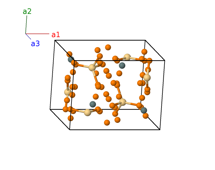 | $\mathbf{B_{14}}$ | = | $- \left(x_{4} - \frac{1}{2}\right) \, \mathbf{a}_{1}+\frac{3}{4} \, \mathbf{a}_{2}+\left(z_{4} + \frac{1}{2}\right) \, \mathbf{a}_{3}$ | = | $- a \left(x_{4} - \frac{1}{2}\right) \,\mathbf{\hat{x}}+\frac{3}{4}b \,\mathbf{\hat{y}}+c \left(z_{4} + \frac{1}{2}\right) \,\mathbf{\hat{z}}$ | (4c) | P III |