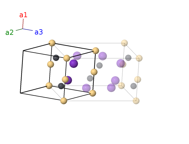 | $\mathbf{B_{4}}$ | = | $\frac{3}{4} \, \mathbf{a}_{1}- \left(y_{2} + z_{2}\right) \, \mathbf{a}_{2}- \left(y_{2} - z_{2}\right) \, \mathbf{a}_{3}$ | = | $\frac{3}{4}a \,\mathbf{\hat{x}}- b y_{2} \,\mathbf{\hat{y}}+c z_{2} \,\mathbf{\hat{z}}$ | (4b) | K I |