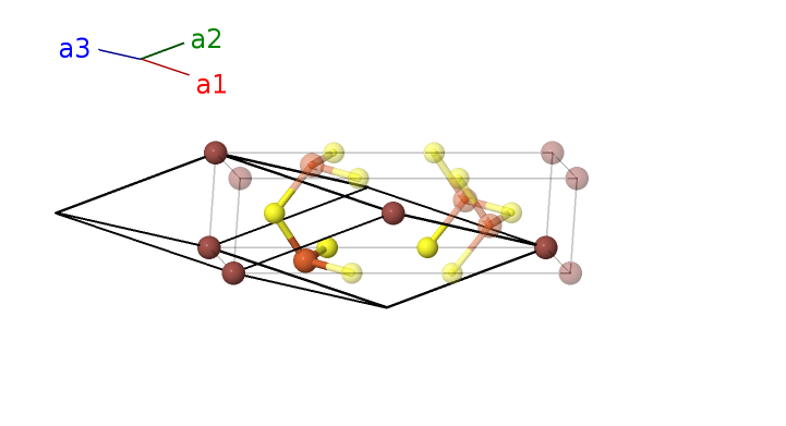 | $\mathbf{B_{2}}$ | = | $\frac{3}{4} \, \mathbf{a}_{1}+\frac{1}{4} \, \mathbf{a}_{2}+\frac{1}{2} \, \mathbf{a}_{3}$ | = | $\frac{1}{2}a \,\mathbf{\hat{y}}+\frac{1}{4}c \,\mathbf{\hat{z}}$ | (2c) | Fe I |