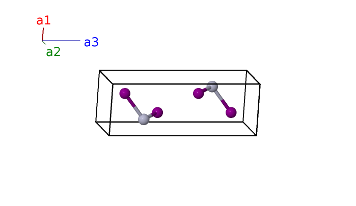 | $\mathbf{B_{2}}$ | = | $\frac{1}{4} \, \mathbf{a}_{1}+\frac{3}{4} \, \mathbf{a}_{2}+\frac{1}{4} \, \mathbf{a}_{3}$ | = | $\frac{1}{4}a \,\mathbf{\hat{x}}+\frac{3}{4}a \,\mathbf{\hat{y}}+\frac{1}{4}c \,\mathbf{\hat{z}}$ | (2a) | Hg I |