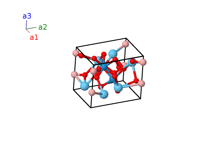 | $\mathbf{B_{26}}$ | = | $- x_{6} \, \mathbf{a}_{1}- y_{6} \, \mathbf{a}_{2}+\left(z_{6} + \frac{1}{2}\right) \, \mathbf{a}_{3}$ | = | $- \frac{1}{2}a \left(x_{6} + y_{6}\right) \,\mathbf{\hat{x}}+\frac{\sqrt{3}}{2}a \left(x_{6} - y_{6}\right) \,\mathbf{\hat{y}}+c \left(z_{6} + \frac{1}{2}\right) \,\mathbf{\hat{z}}$ | (6c) | O III |