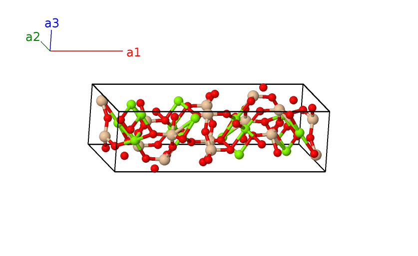 | $\mathbf{B_{32}}$ | = | $- \left(x_{4} - \frac{1}{2}\right) \, \mathbf{a}_{1}+\left(y_{4} + \frac{1}{2}\right) \, \mathbf{a}_{2}+z_{4} \, \mathbf{a}_{3}$ | = | $- a \left(x_{4} - \frac{1}{2}\right) \,\mathbf{\hat{x}}+b \left(y_{4} + \frac{1}{2}\right) \,\mathbf{\hat{y}}+c z_{4} \,\mathbf{\hat{z}}$ | (8c) | O II |