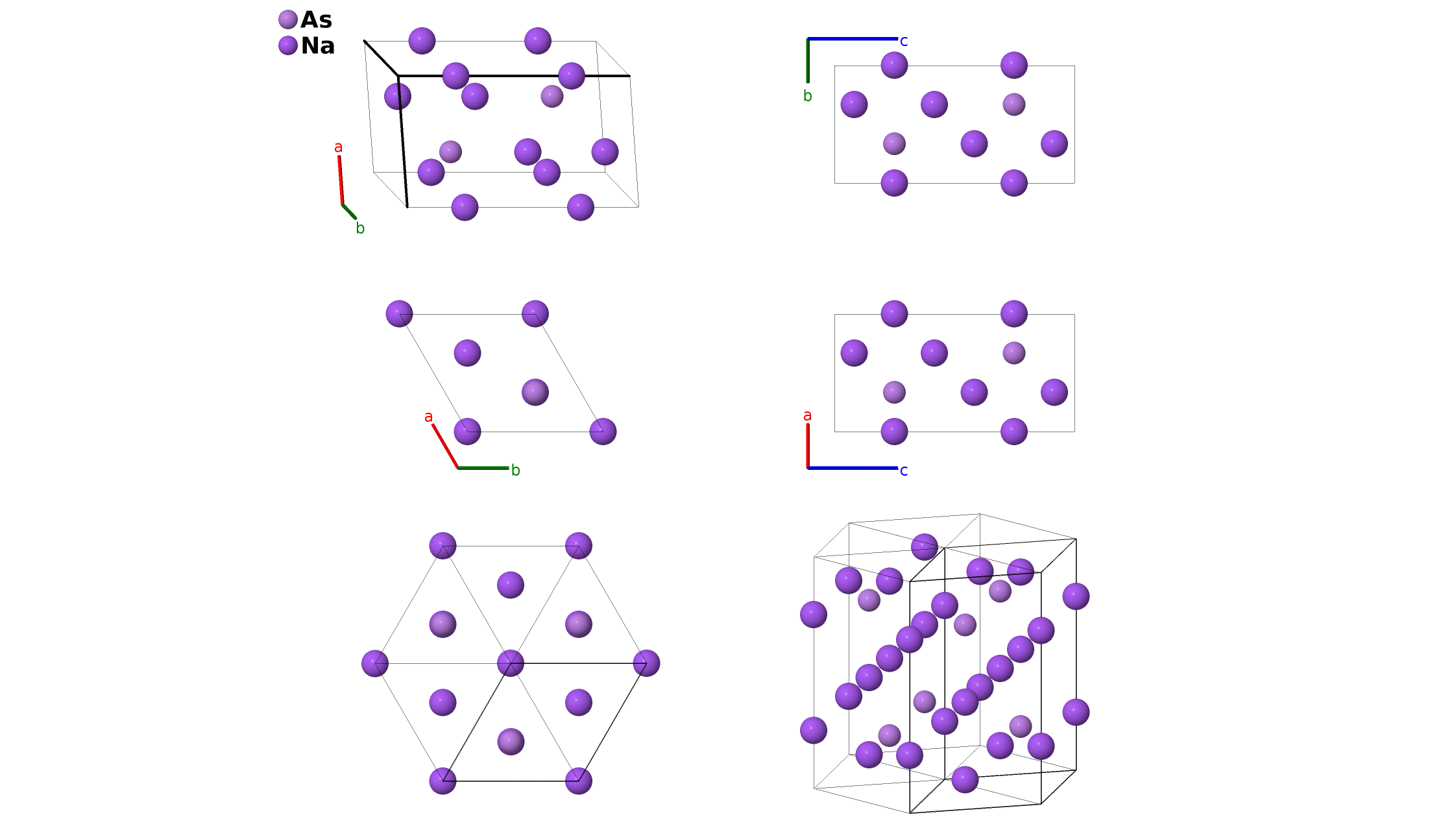 | $\mathbf{B_{5}}$ | = | $\frac{1}{3} \, \mathbf{a}_{1}+\frac{2}{3} \, \mathbf{a}_{2}+z_{3} \, \mathbf{a}_{3}$ | = | $\frac{1}{2}a \,\mathbf{\hat{x}}+\frac{\sqrt{3}}{6}a \,\mathbf{\hat{y}}+c z_{3} \,\mathbf{\hat{z}}$ | (4f) | Na II |