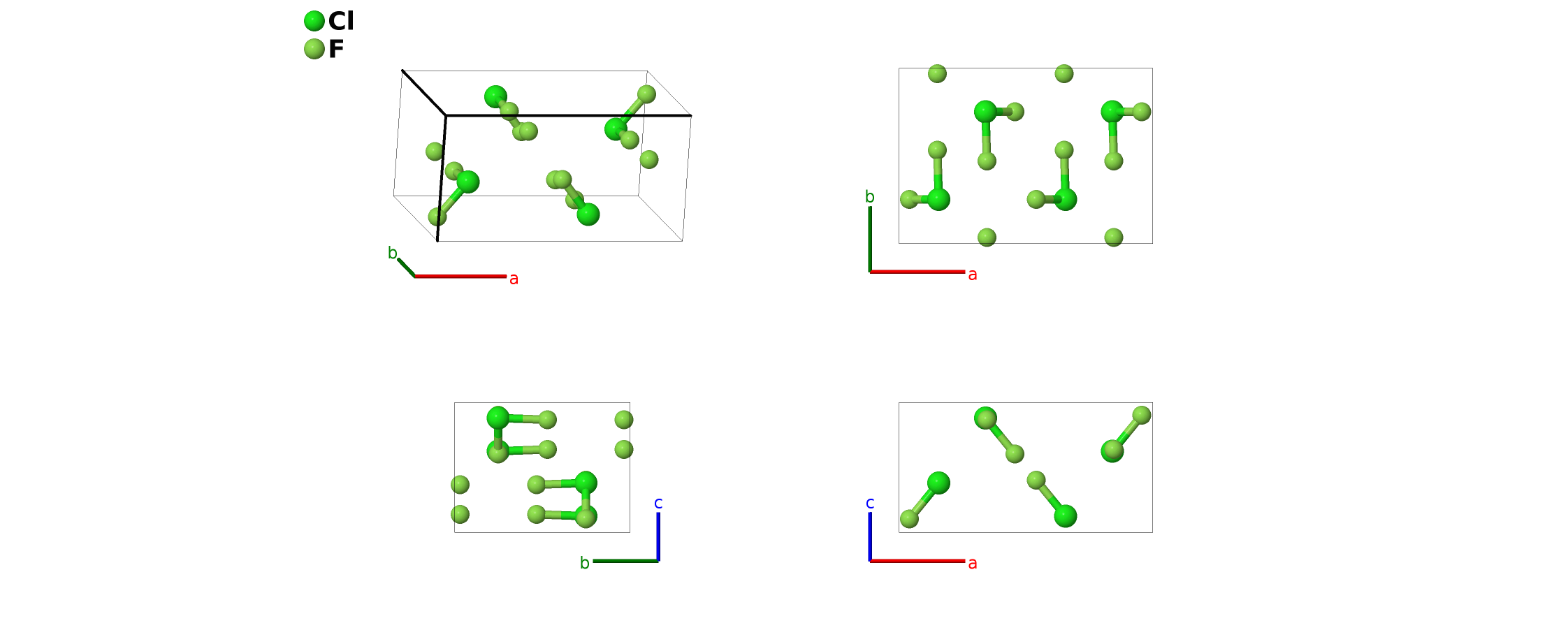 | $\mathbf{B_{4}}$ | = | $\left(x_{1} + \frac{1}{2}\right) \, \mathbf{a}_{1}+\frac{1}{4} \, \mathbf{a}_{2}- \left(z_{1} - \frac{1}{2}\right) \, \mathbf{a}_{3}$ | = | $a \left(x_{1} + \frac{1}{2}\right) \,\mathbf{\hat{x}}+\frac{1}{4}b \,\mathbf{\hat{y}}- c \left(z_{1} - \frac{1}{2}\right) \,\mathbf{\hat{z}}$ | (4c) | Cl I |
