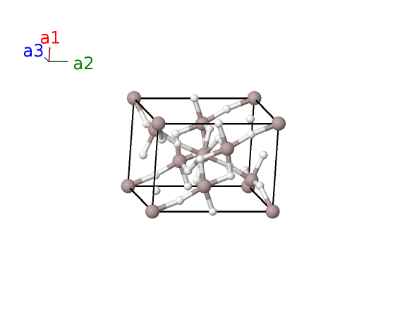 | $\mathbf{B_{12}}$ | = | $\left(x_{4} + \frac{1}{2}\right) \, \mathbf{a}_{1}- \left(y_{4} - \frac{1}{2}\right) \, \mathbf{a}_{2}+\frac{1}{2} \, \mathbf{a}_{3}$ | = | $a \left(x_{4} + \frac{1}{2}\right) \,\mathbf{\hat{x}}- b \left(y_{4} - \frac{1}{2}\right) \,\mathbf{\hat{y}}+\frac{1}{2}c \,\mathbf{\hat{z}}$ | (4g) | H II |