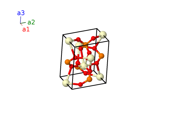 | $\mathbf{B_{18}}$ | = | $x_{3} \, \mathbf{a}_{1}+\left(x_{3} - y_{3}\right) \, \mathbf{a}_{2}- \left(z_{3} - \frac{1}{3}\right) \, \mathbf{a}_{3}$ | = | $\frac{1}{2}a \left(2 x_{3} - y_{3}\right) \,\mathbf{\hat{x}}- \frac{\sqrt{3}}{2}a y_{3} \,\mathbf{\hat{y}}- c \left(z_{3} - \frac{1}{3}\right) \,\mathbf{\hat{z}}$ | (12k) | O I |