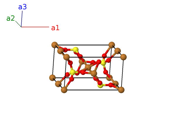 | $\mathbf{B_{4}}$ | = | $\frac{1}{2} \, \mathbf{a}_{1}+\frac{1}{2} \, \mathbf{a}_{2}+\frac{1}{2} \, \mathbf{a}_{3}$ | = | $\frac{1}{2}a \,\mathbf{\hat{x}}+\frac{1}{2}b \,\mathbf{\hat{y}}+\frac{1}{2}c \,\mathbf{\hat{z}}$ | (4a) | Cu I |