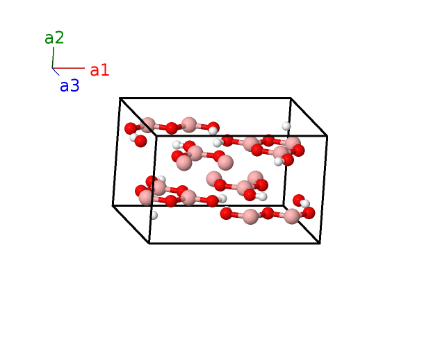| $\mathbf{B_{32}}$ | = | $\left(x_{8} + \frac{1}{2}\right) \, \mathbf{a}_{1}+\frac{1}{4} \, \mathbf{a}_{2}- \left(z_{8} - \frac{1}{2}\right) \, \mathbf{a}_{3}$ | = | $a \left(x_{8} + \frac{1}{2}\right) \,\mathbf{\hat{x}}+\frac{1}{4}b \,\mathbf{\hat{y}}- c \left(z_{8} - \frac{1}{2}\right) \,\mathbf{\hat{z}}$ | (4c) | O II |
