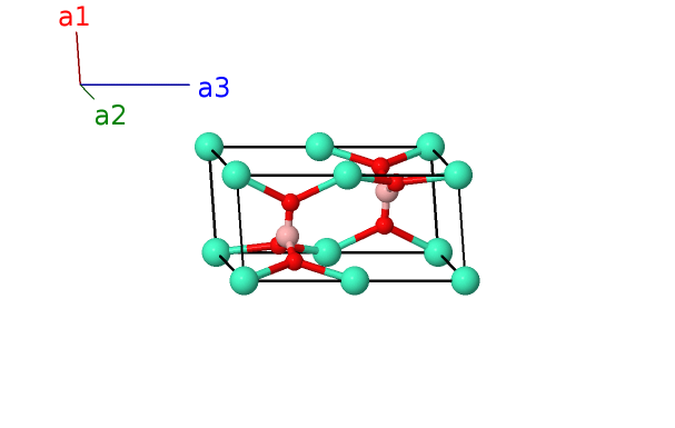 | $\mathbf{B_{8}}$ | = | $- x_{3} \, \mathbf{a}_{1}- 2 x_{3} \, \mathbf{a}_{2}+\frac{3}{4} \, \mathbf{a}_{3}$ | = | $- \frac{3}{2}a x_{3} \,\mathbf{\hat{x}}- \frac{\sqrt{3}}{2}a x_{3} \,\mathbf{\hat{y}}+\frac{3}{4}c \,\mathbf{\hat{z}}$ | (6h) | O I |