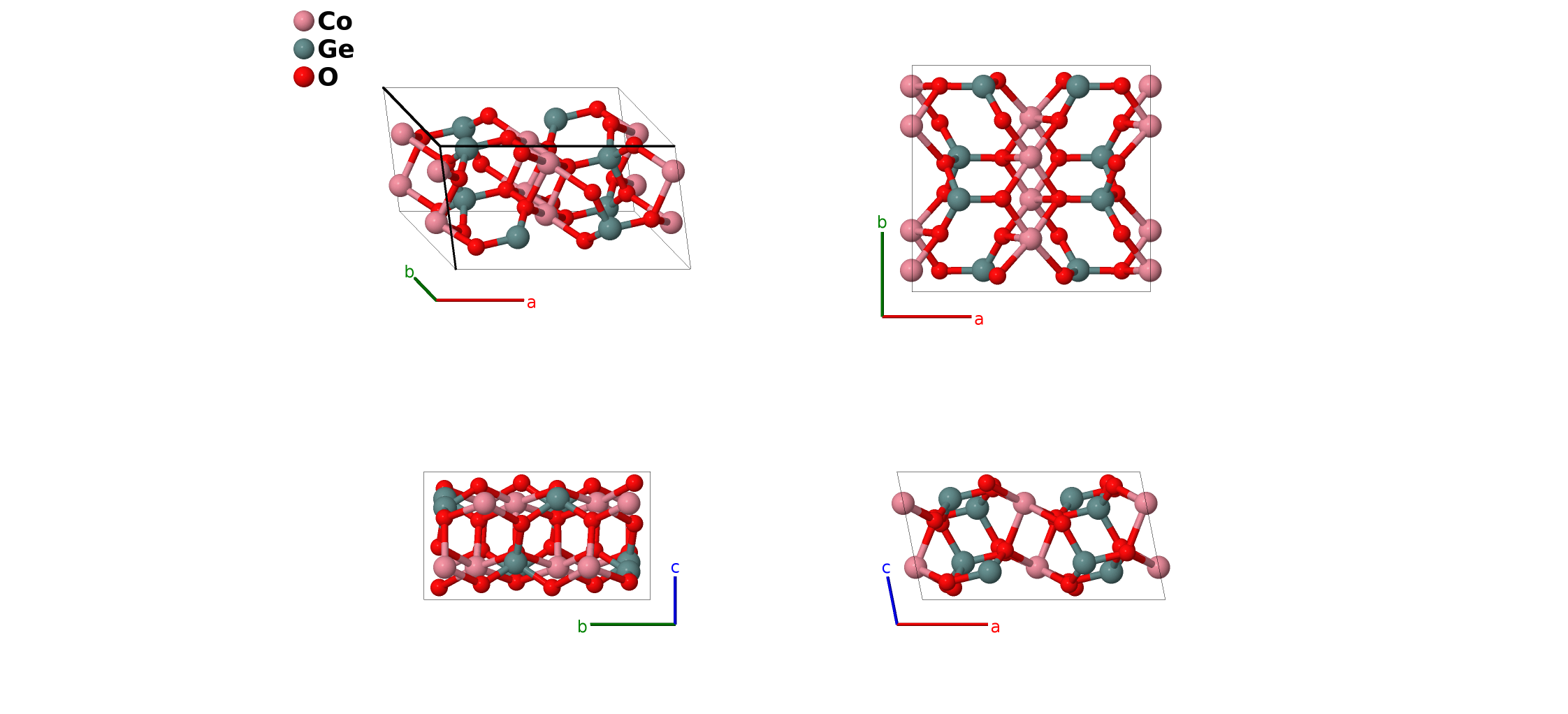 | $\mathbf{B_{4}}$ | = | $y_{2} \, \mathbf{a}_{1}- y_{2} \, \mathbf{a}_{2}+\frac{3}{4} \, \mathbf{a}_{3}$ | = | $\frac{3}{4}c \cos{\beta} \,\mathbf{\hat{x}}- b y_{2} \,\mathbf{\hat{y}}+\frac{3}{4}c \sin{\beta} \,\mathbf{\hat{z}}$ | (4e) | Co II |