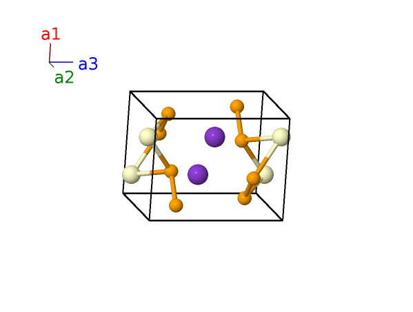 | $\mathbf{B_{3}}$ | = | $\frac{1}{4} \, \mathbf{a}_{1}+\frac{1}{4} \, \mathbf{a}_{2}+\frac{1}{2} \, \mathbf{a}_{3}$ | = | $\frac{1}{4}a \,\mathbf{\hat{x}}+\frac{1}{4}a \,\mathbf{\hat{y}}+\frac{1}{2}c \,\mathbf{\hat{z}}$ | (2b) | K I |