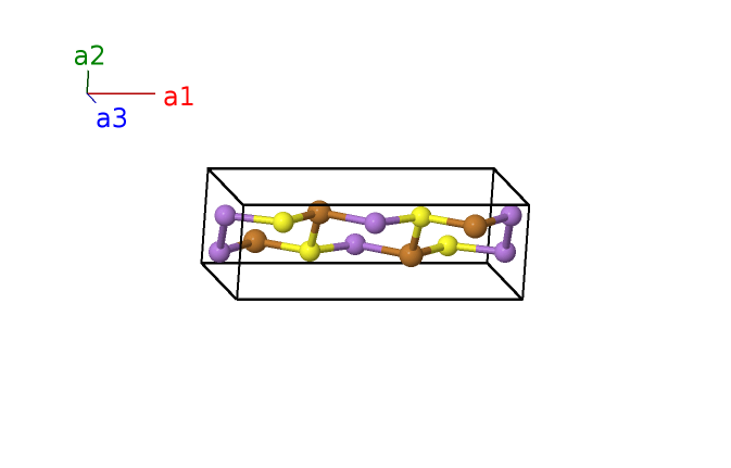 | $\mathbf{B_{7}}$ | = | $- x_{2} \, \mathbf{a}_{1}+\frac{3}{4} \, \mathbf{a}_{2}- z_{2} \, \mathbf{a}_{3}$ | = | $- a x_{2} \,\mathbf{\hat{x}}+\frac{3}{4}b \,\mathbf{\hat{y}}- c z_{2} \,\mathbf{\hat{z}}$ | (4c) | Cu I |