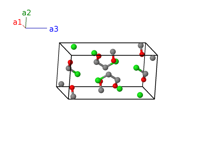 | $\mathbf{B_{12}}$ | = | $\left(x_{2} + \frac{1}{2}\right) \, \mathbf{a}_{1}- \left(y_{2} - \frac{1}{2}\right) \, \mathbf{a}_{2}- z_{2} \, \mathbf{a}_{3}$ | = | $a \left(x_{2} + \frac{1}{2}\right) \,\mathbf{\hat{x}}- b \left(y_{2} - \frac{1}{2}\right) \,\mathbf{\hat{y}}- c z_{2} \,\mathbf{\hat{z}}$ | (8c) | Cl I |