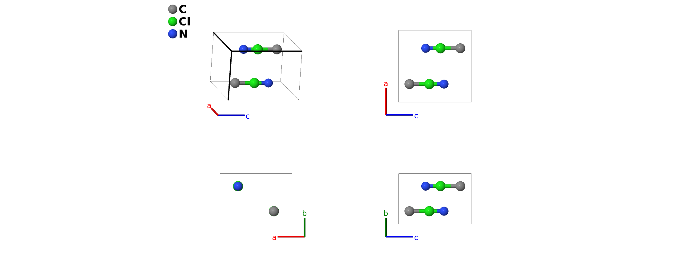 | $\mathbf{B_{3}}$ | = | $\frac{1}{4} \, \mathbf{a}_{1}+\frac{1}{4} \, \mathbf{a}_{2}+z_{2} \, \mathbf{a}_{3}$ | = | $\frac{1}{4}a \,\mathbf{\hat{x}}+\frac{1}{4}b \,\mathbf{\hat{y}}+c z_{2} \,\mathbf{\hat{z}}$ | (2a) | Cl I |