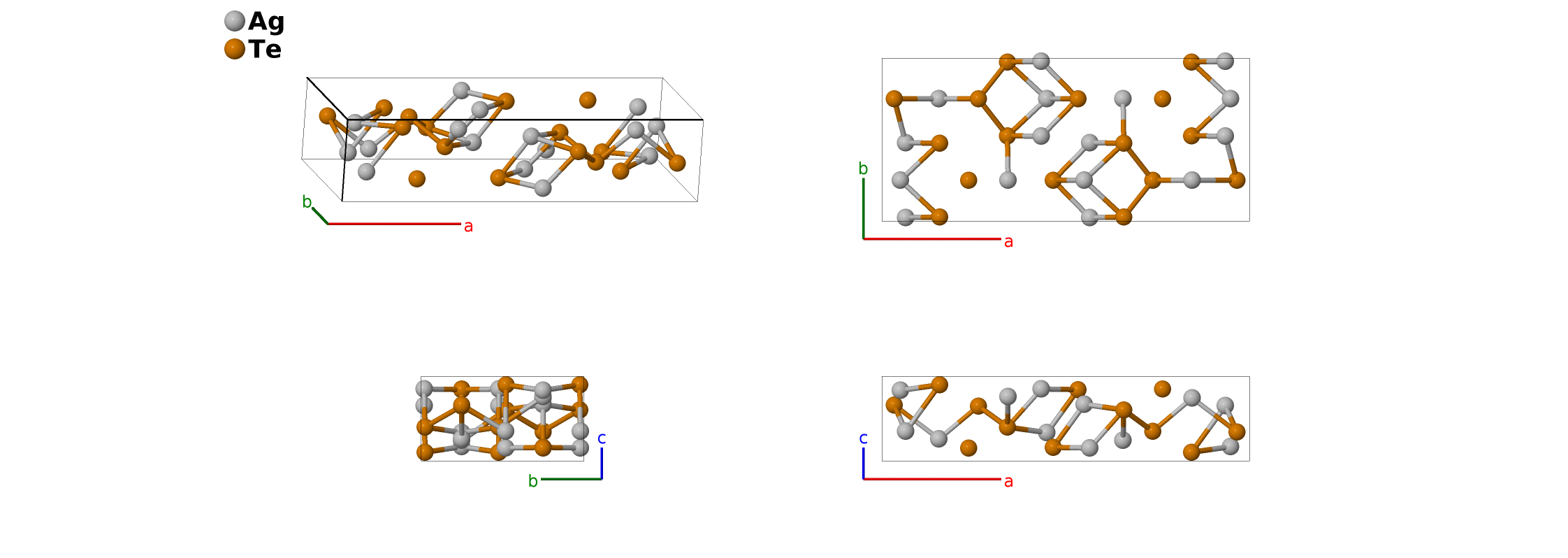 | $\mathbf{B_{5}}$ | = | $x_{2} \, \mathbf{a}_{1}+\frac{1}{4} \, \mathbf{a}_{2}+z_{2} \, \mathbf{a}_{3}$ | = | $a x_{2} \,\mathbf{\hat{x}}+\frac{1}{4}b \,\mathbf{\hat{y}}+c z_{2} \,\mathbf{\hat{z}}$ | (4c) | Ag II |