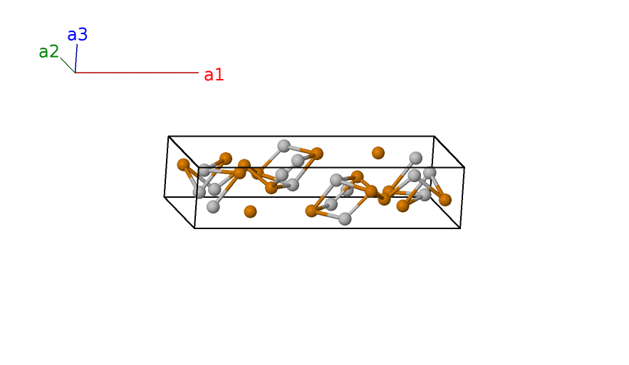 | $\mathbf{B_{7}}$ | = | $- x_{2} \, \mathbf{a}_{1}+\frac{3}{4} \, \mathbf{a}_{2}- z_{2} \, \mathbf{a}_{3}$ | = | $- a x_{2} \,\mathbf{\hat{x}}+\frac{3}{4}b \,\mathbf{\hat{y}}- c z_{2} \,\mathbf{\hat{z}}$ | (4c) | Ag II |