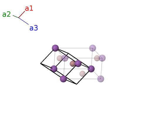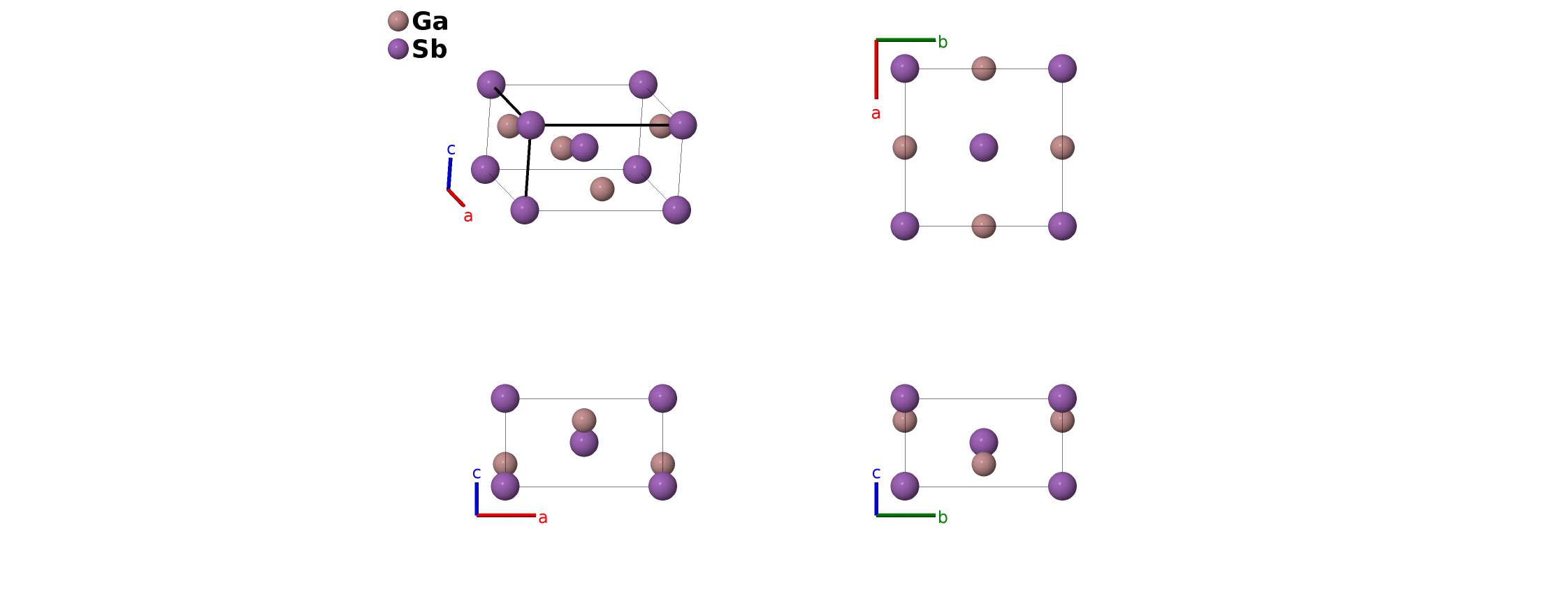 | $\mathbf{B_{2}}$ | = | $\frac{3}{4} \, \mathbf{a}_{1}+\frac{1}{4} \, \mathbf{a}_{2}+\frac{1}{2} \, \mathbf{a}_{3}$ | = | $\frac{1}{2}a \,\mathbf{\hat{y}}+\frac{1}{4}c \,\mathbf{\hat{z}}$ | (2c) | Ga I |