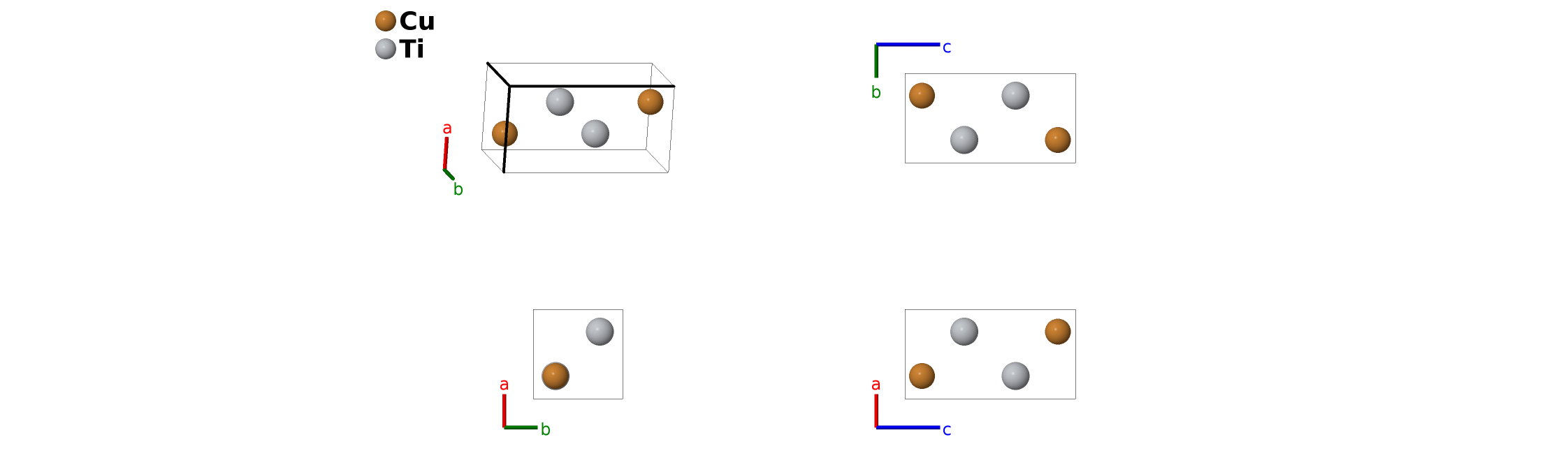 | $\mathbf{B_{2}}$ | = | $\frac{3}{4} \, \mathbf{a}_{1}+\frac{3}{4} \, \mathbf{a}_{2}- z_{1} \, \mathbf{a}_{3}$ | = | $\frac{3}{4}a \,\mathbf{\hat{x}}+\frac{3}{4}a \,\mathbf{\hat{y}}- c z_{1} \,\mathbf{\hat{z}}$ | (2c) | Cu I |
