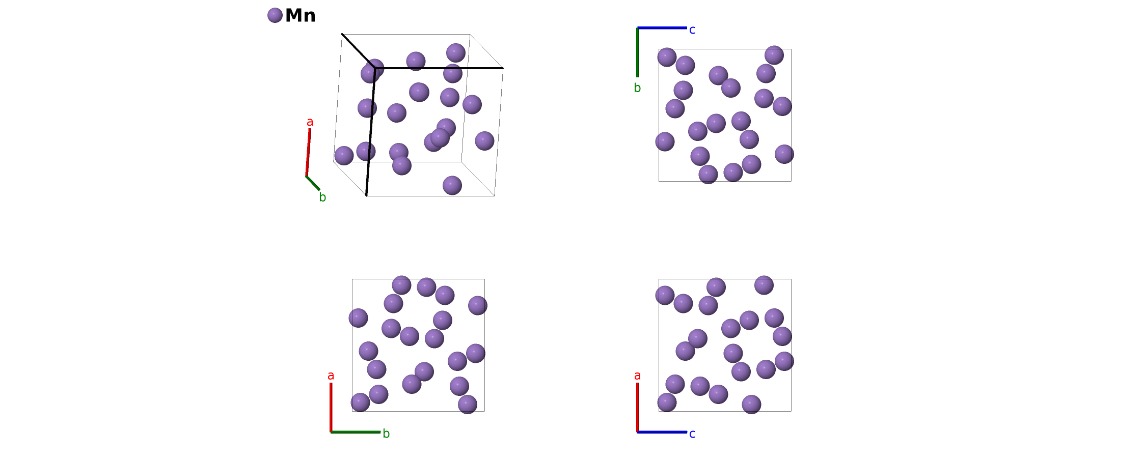 | $\mathbf{B_{6}}$ | = | $- \left(x_{1} - \frac{3}{4}\right) \, \mathbf{a}_{1}- \left(x_{1} - \frac{3}{4}\right) \, \mathbf{a}_{2}- \left(x_{1} - \frac{3}{4}\right) \, \mathbf{a}_{3}$ | = | $- a \left(x_{1} - \frac{3}{4}\right) \,\mathbf{\hat{x}}- a \left(x_{1} - \frac{3}{4}\right) \,\mathbf{\hat{y}}- a \left(x_{1} - \frac{3}{4}\right) \,\mathbf{\hat{z}}$ | (8c) | Mn I |