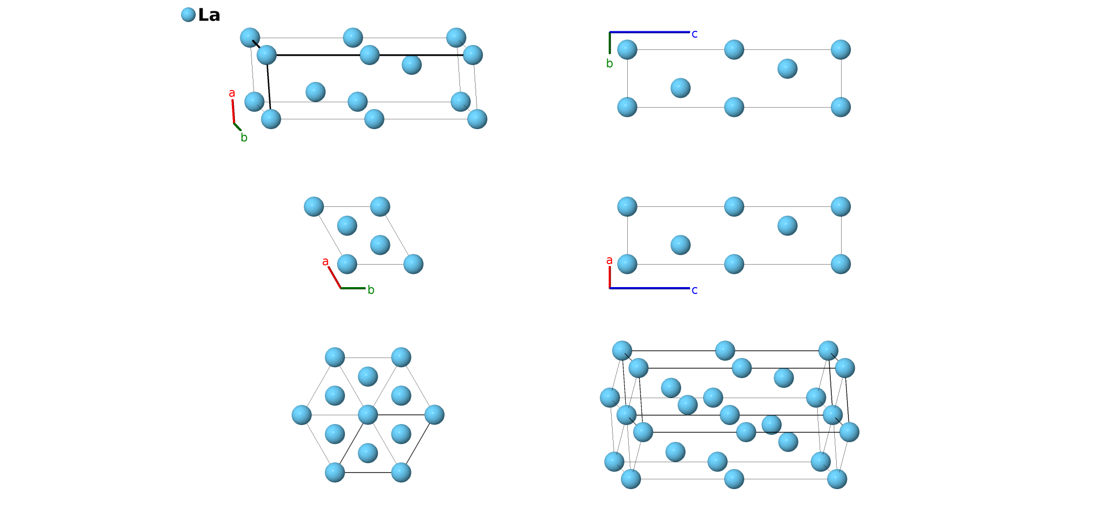 | $\mathbf{B_{3}}$ | = | $\frac{1}{3} \, \mathbf{a}_{1}+\frac{2}{3} \, \mathbf{a}_{2}+\frac{1}{4} \, \mathbf{a}_{3}$ | = | $\frac{1}{2}a \,\mathbf{\hat{x}}+\frac{\sqrt{3}}{6}a \,\mathbf{\hat{y}}+\frac{1}{4}c \,\mathbf{\hat{z}}$ | (2c) | La II |