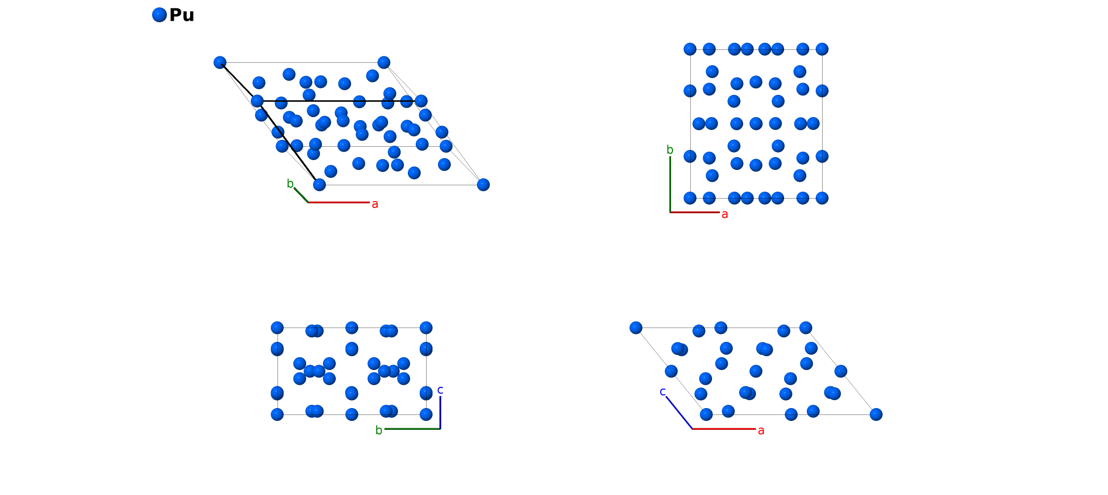 | $\mathbf{B_{4}}$ | = | $x_{3} \, \mathbf{a}_{1}+x_{3} \, \mathbf{a}_{2}+z_{3} \, \mathbf{a}_{3}$ | = | $\left(a x_{3} + c z_{3} \cos{\beta}\right) \,\mathbf{\hat{x}}+c z_{3} \sin{\beta} \,\mathbf{\hat{z}}$ | (4i) | Pu III |