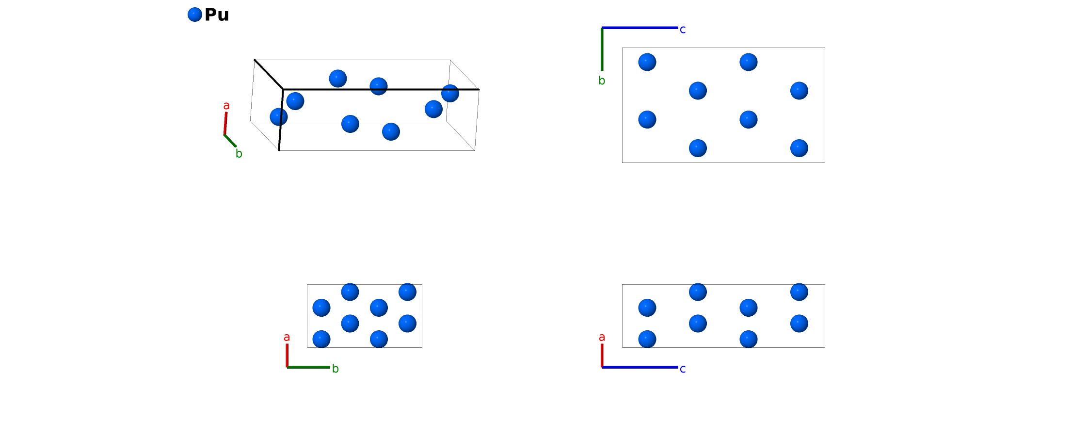| $\mathbf{B_{2}}$ | = | $\frac{7}{8} \, \mathbf{a}_{1}+\frac{7}{8} \, \mathbf{a}_{2}+\frac{7}{8} \, \mathbf{a}_{3}$ | = | $\frac{7}{8}a \,\mathbf{\hat{x}}+\frac{7}{8}b \,\mathbf{\hat{y}}+\frac{7}{8}c \,\mathbf{\hat{z}}$ | (8a) | Pu I |