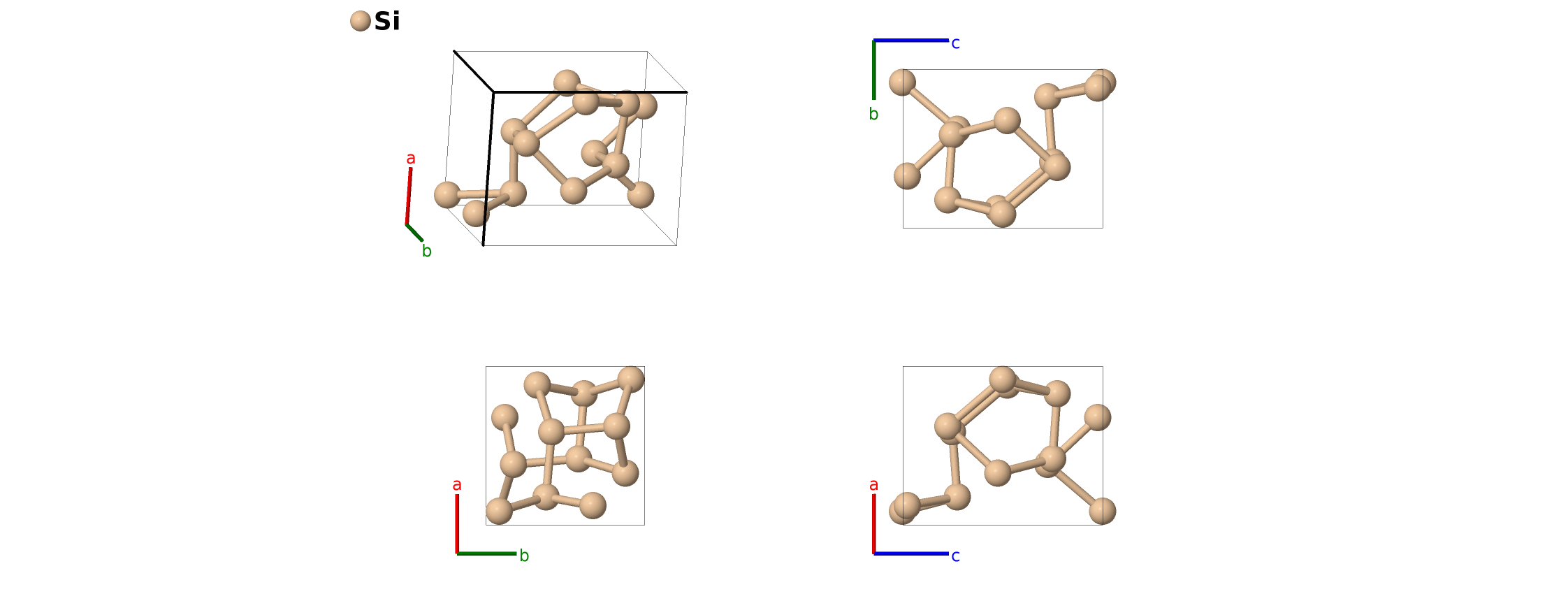 | $\mathbf{B_{4}}$ | = | $\left(x_{1} + \frac{1}{2}\right) \, \mathbf{a}_{1}- \left(x_{1} - \frac{1}{2}\right) \, \mathbf{a}_{2}+\frac{1}{4} \, \mathbf{a}_{3}$ | = | $a \left(x_{1} + \frac{1}{2}\right) \,\mathbf{\hat{x}}- a \left(x_{1} - \frac{1}{2}\right) \,\mathbf{\hat{y}}+\frac{1}{4}c \,\mathbf{\hat{z}}$ | (4a) | Si I |