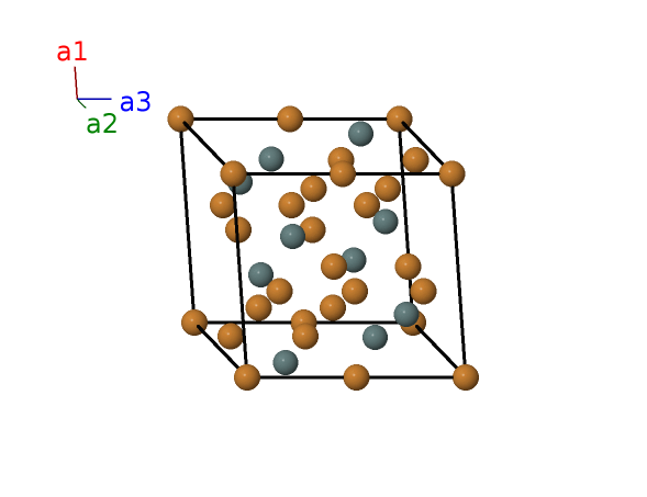 | $\mathbf{B_{3}}$ | = | $\frac{1}{3} \, \mathbf{a}_{1}+\frac{2}{3} \, \mathbf{a}_{2}+\frac{1}{4} \, \mathbf{a}_{3}$ | = | $\frac{1}{2}a \,\mathbf{\hat{x}}+\frac{\sqrt{3}}{6}a \,\mathbf{\hat{y}}+\frac{1}{4}c \,\mathbf{\hat{z}}$ | (2c) | Cu II |
