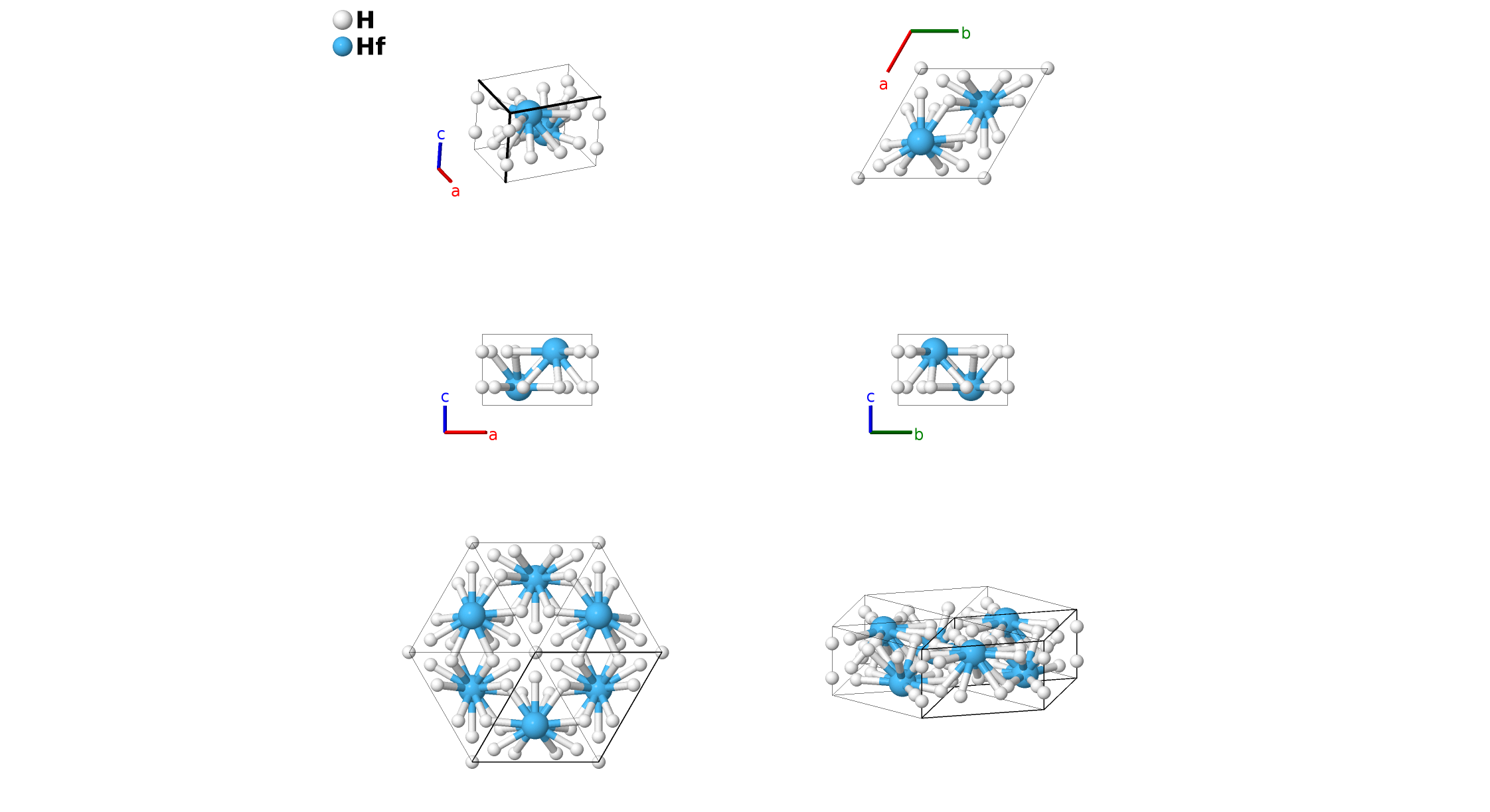 | $\mathbf{B_{3}}$ | = | $\frac{1}{3} \, \mathbf{a}_{1}+\frac{2}{3} \, \mathbf{a}_{2}+\frac{1}{4} \, \mathbf{a}_{3}$ | = | $\frac{1}{2}a \,\mathbf{\hat{x}}+\frac{\sqrt{3}}{6}a \,\mathbf{\hat{y}}+\frac{1}{4}c \,\mathbf{\hat{z}}$ | (2c) | Hf I |