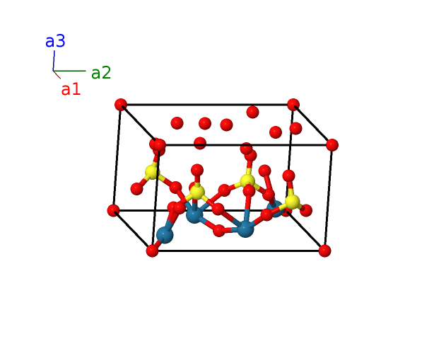 | $\mathbf{B_{21}}$ | = | $\left(x_{6} + \frac{1}{2}\right) \, \mathbf{a}_{1}- \left(y_{6} - \frac{1}{2}\right) \, \mathbf{a}_{2}+z_{6} \, \mathbf{a}_{3}$ | = | $a \left(x_{6} + \frac{1}{2}\right) \,\mathbf{\hat{x}}- b \left(y_{6} - \frac{1}{2}\right) \,\mathbf{\hat{y}}+c z_{6} \,\mathbf{\hat{z}}$ | (4c) | O VI |