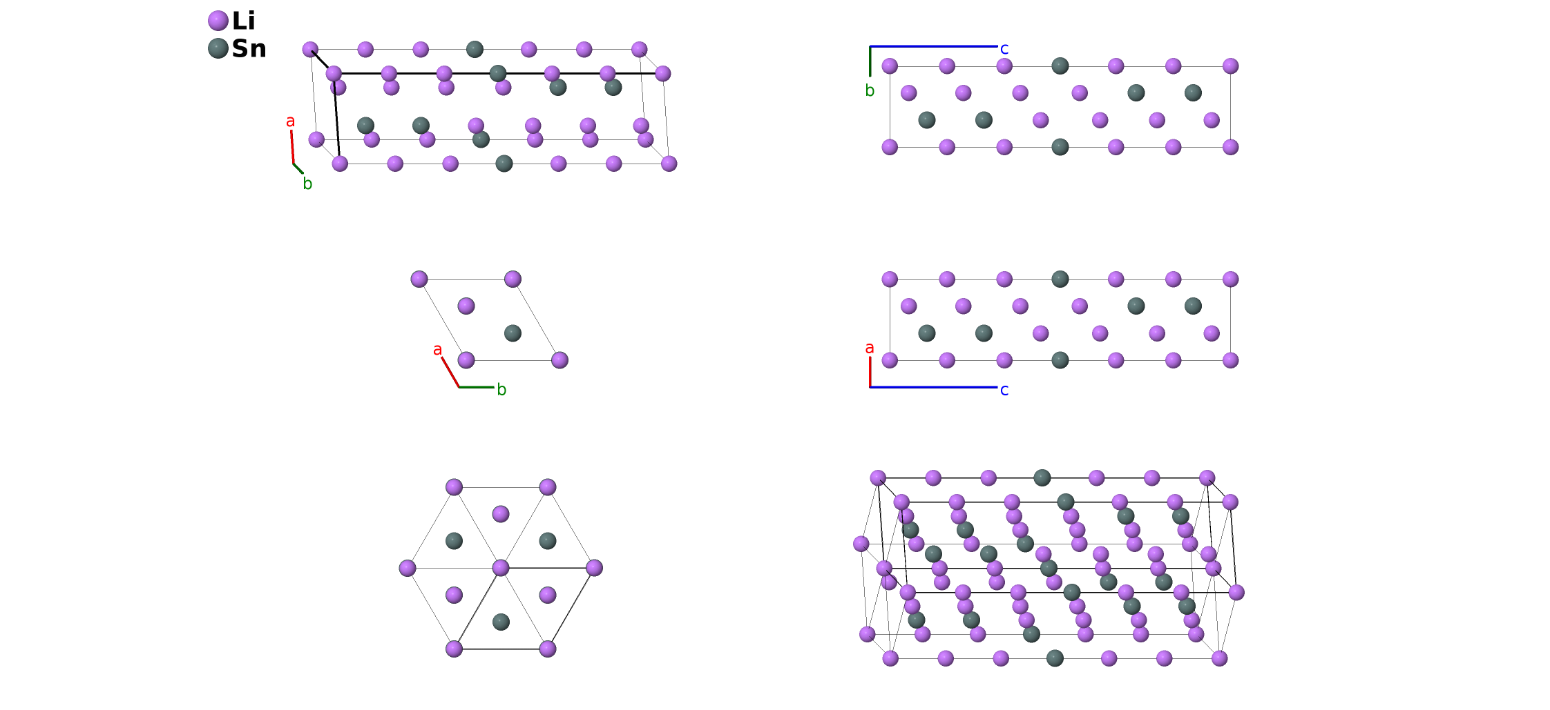 | $\mathbf{B_{9}}$ | = | $\frac{1}{3} \, \mathbf{a}_{1}+\frac{2}{3} \, \mathbf{a}_{2}+z_{6} \, \mathbf{a}_{3}$ | = | $\frac{1}{2}a \,\mathbf{\hat{x}}+\frac{\sqrt{3}}{6}a \,\mathbf{\hat{y}}+c z_{6} \,\mathbf{\hat{z}}$ | (2d) | Li V |
