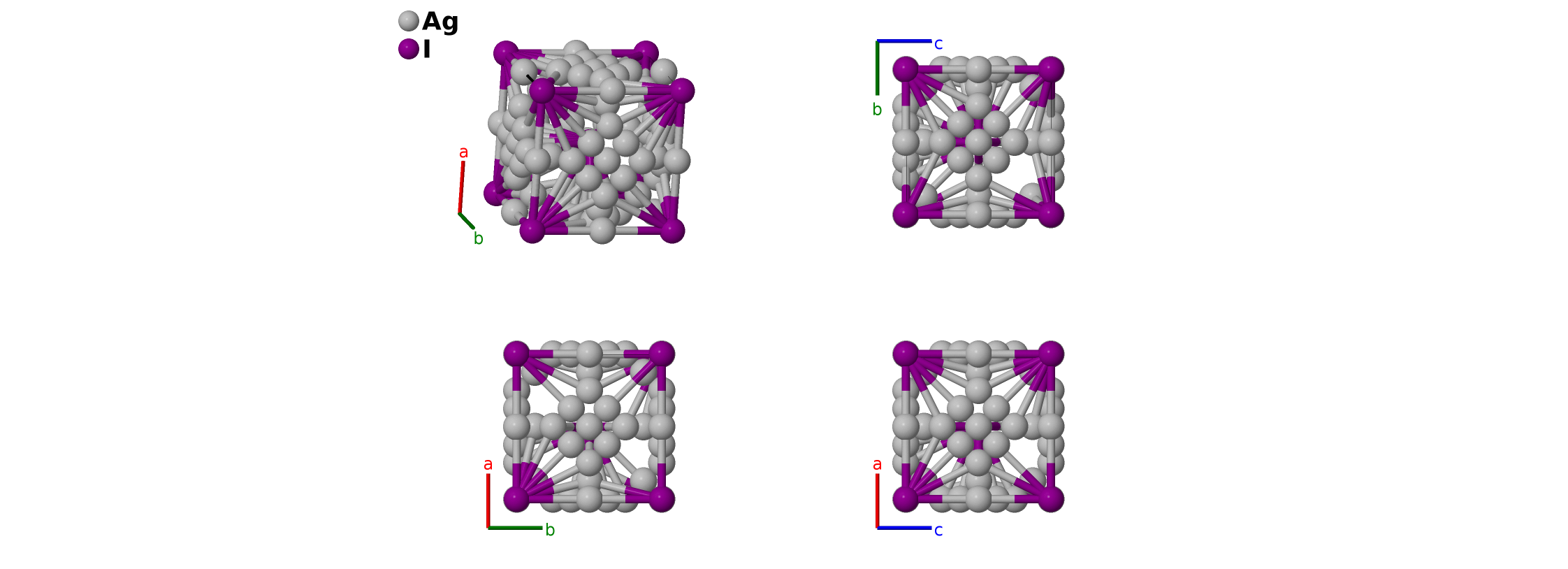 | $\mathbf{B_{2}}$ | = | $\frac{1}{2} \, \mathbf{a}_{2}+\frac{1}{2} \, \mathbf{a}_{3}$ | = | $\frac{1}{2}a \,\mathbf{\hat{x}}$ | (6b) | Ag I |