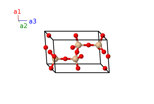 | $\mathbf{B_{1}}$ | = | $\frac{1}{3} \, \mathbf{a}_{1}+\frac{2}{3} \, \mathbf{a}_{2}+\frac{1}{4} \, \mathbf{a}_{3}$ | = | $\frac{1}{2}a \,\mathbf{\hat{x}}+\frac{\sqrt{3}}{6}a \,\mathbf{\hat{y}}+\frac{1}{4}c \,\mathbf{\hat{z}}$ | (2c) | O I |
