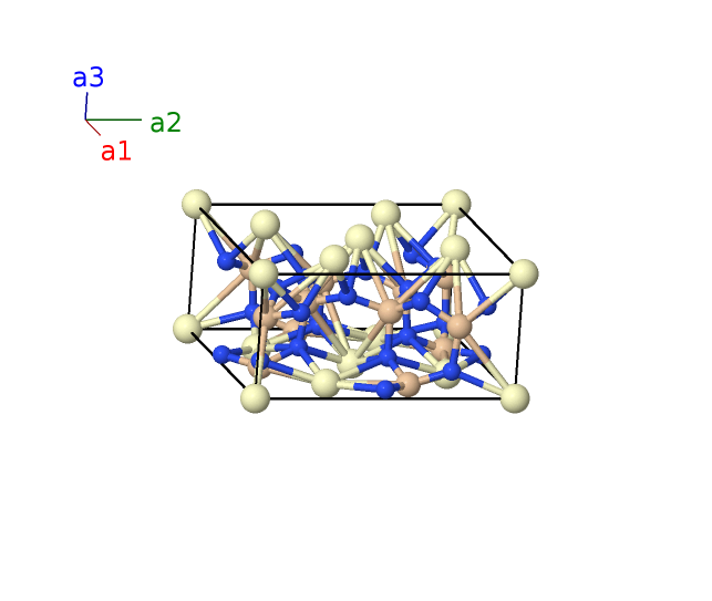 | $\mathbf{B_{30}}$ | = | $- \left(x_{7} - \frac{1}{2}\right) \, \mathbf{a}_{1}+\left(y_{7} + \frac{1}{2}\right) \, \mathbf{a}_{2}+z_{7} \, \mathbf{a}_{3}$ | = | $- a \left(x_{7} - \frac{1}{2}\right) \,\mathbf{\hat{x}}+a \left(y_{7} + \frac{1}{2}\right) \,\mathbf{\hat{y}}+c z_{7} \,\mathbf{\hat{z}}$ | (8d) | N IV |