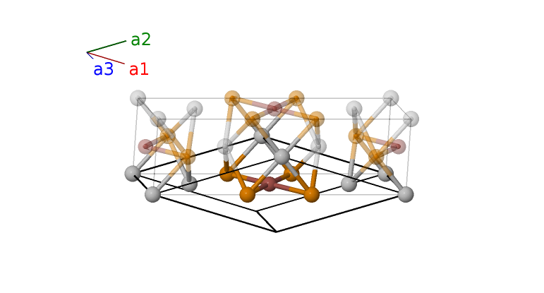 | $\mathbf{B_{2}}$ | = | $\frac{1}{2} \, \mathbf{a}_{1}+\frac{1}{2} \, \mathbf{a}_{2}+\frac{1}{2} \, \mathbf{a}_{3}$ | = | $\frac{1}{2}a \,\mathbf{\hat{x}}+\frac{1}{2}c \,\mathbf{\hat{z}}$ | (2c) | Tl I |